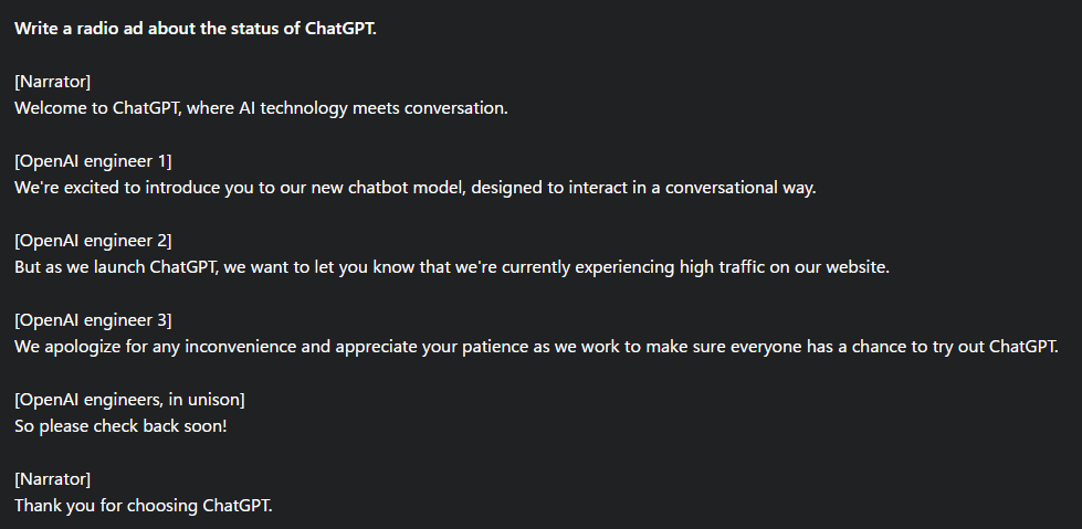 一番上に「Write a radio ad about the status of ChatGPT.」と書いてある。これが指示(プロンプト)で、その下はその指示を受けてAIが生成した文章。「ChatGPTの状況についてラジオCMを書いて」という指示に対し、ChatGPTがラジオCMの台本を書いたわけである。そのラジオCMは日本語にするとこんな感じだろうか。