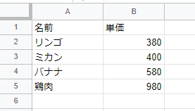 まず、スプレッドシートで次のような表を作ってみる。リンゴやミカンなどの商品名がA列に並び、B列にはその単価が並ぶ単純な表だ。